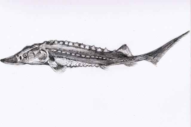 中华鲟生长较快ღ★★ღ,体型硕大ღ★★ღ,最大个体体长可达4米ღ★★ღ,体重可达680千克ღ★★ღ,最长寿命可达40龄以上 上海海洋大学学生手绘